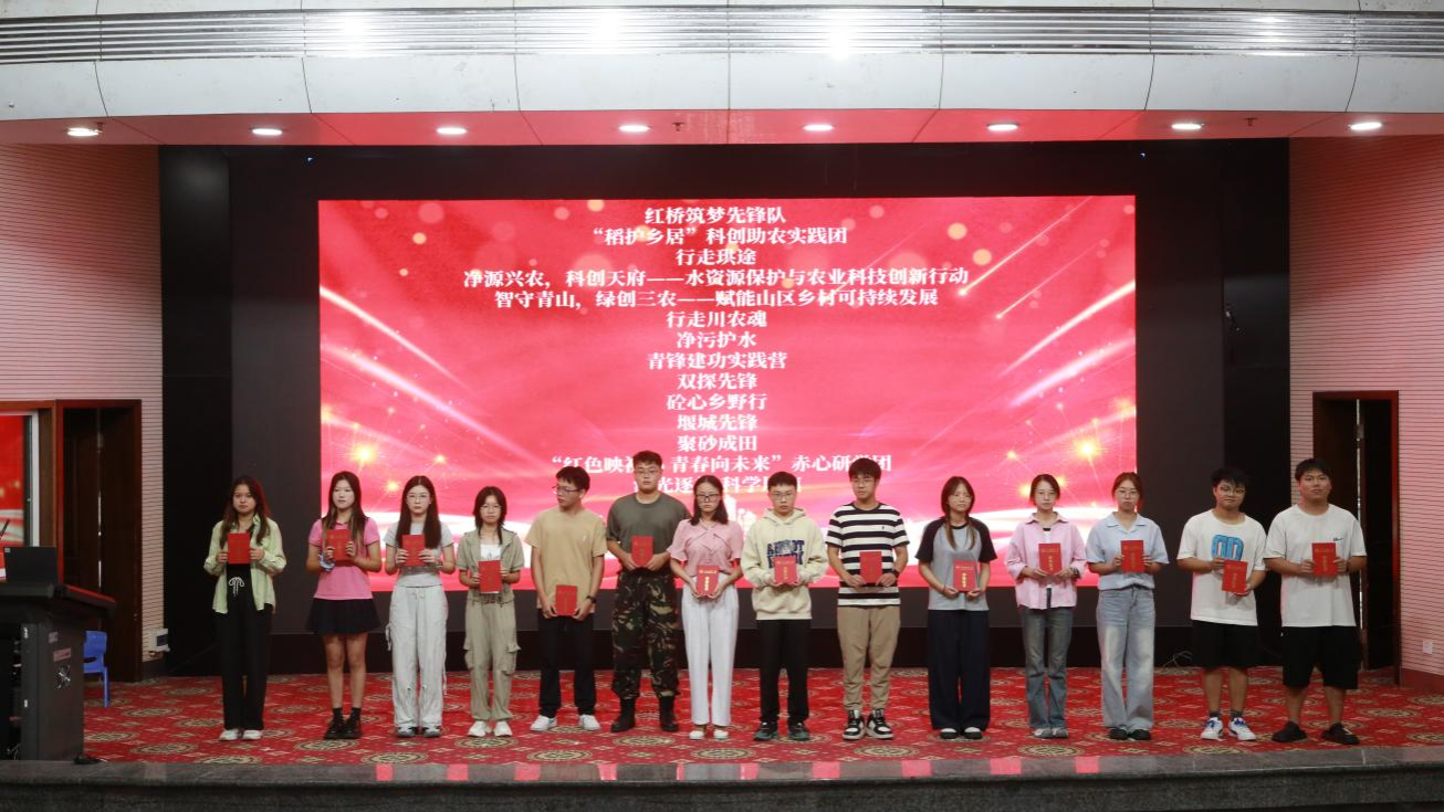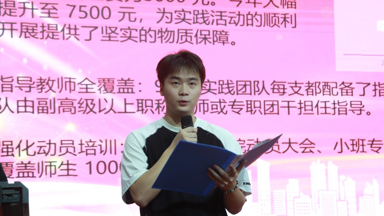 大会伊始,学院学生实践与志愿服务中心实践部负责人作暑期社会实践工作总结汇报。今年暑期,学院紧扣育人核心目标,统筹推进主题实践活动,参与规模与成果质量实现历史性突破。数据显示,全院1269名学生组建94支实践团队投身实践,其中本科生参与率达100%,较去年增长39.87%;研究生参与率64.28%,同比大幅提升194.06%,成功达成 “全覆盖、高参与” 的实践目标。实践足迹遍布全国各地,内容深度契合专业特色与社会需求,涵盖乡村振兴、工程实地调研、社区服务等多个重点领域。经学院初评与学校终审,13支团队入选校级重点团队,25支团队获评院级重点团队,14支团队斩获 “校级优秀团队” 称号,同时涌现出优秀社会实践案例、优秀调研报告各1项,多篇实践成果获县级以上单位表扬信肯定。