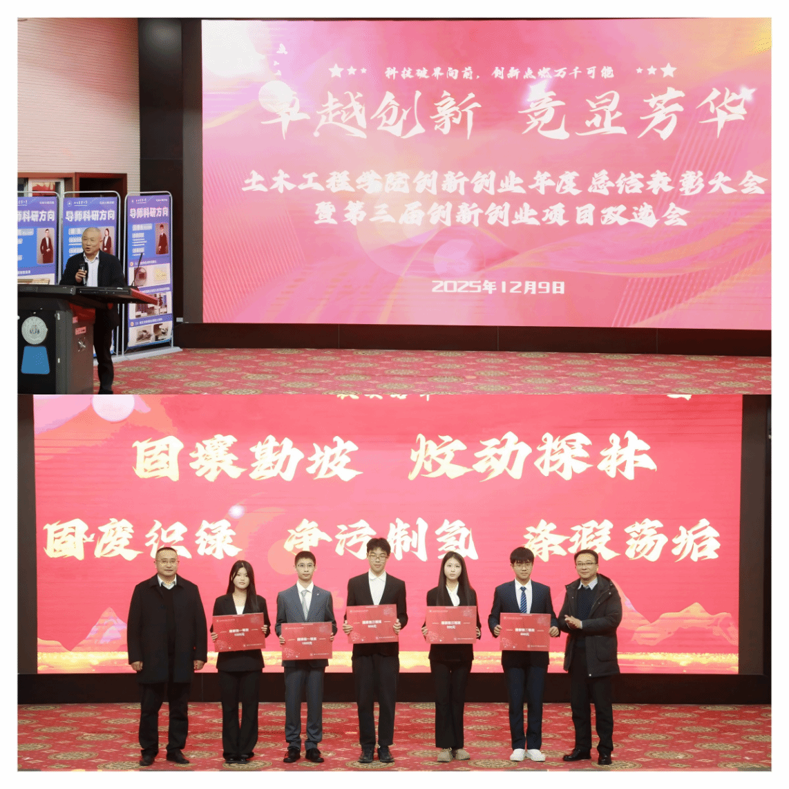 12月9日下午,土木工程学院创新创业年度表彰大会暨第三届项目双选会现场气氛热烈,17支科研团队集中亮相,吸引近400名学生踊跃咨询、现场对接。这场已连续举办两年的品牌活动,不仅是师生双向奔赴的“科创相亲会”,更是学院系统推进专创融合育人成果的集中展示。近年来,学院以“三阶贯通”培育体系和“五环联动”发展模型为抓手,推动创新创业教育深度融入人才培养全过程,在国家级高水平竞赛中屡创佳绩,形成了具有鲜明土木特色的双创育人新生态。