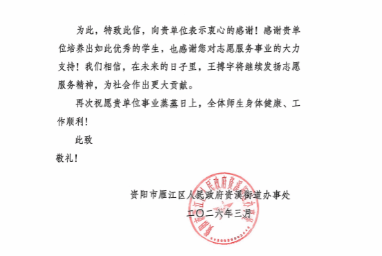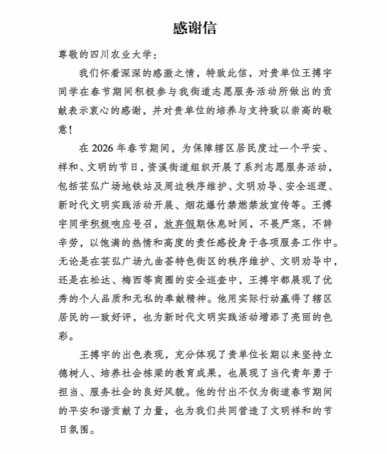近日,四川农业大学土木工程学院收到一封来自资阳市雁江区人民政府资溪街道办事处的感谢信,信中对学院道桥202504班王搏宇同学在2026年春节期间积极参与当地志愿服务、无私奉献的行为给予高度评价与诚挚感谢,充分展现了川农土木学子担当有为、服务社会的良好精神风貌。